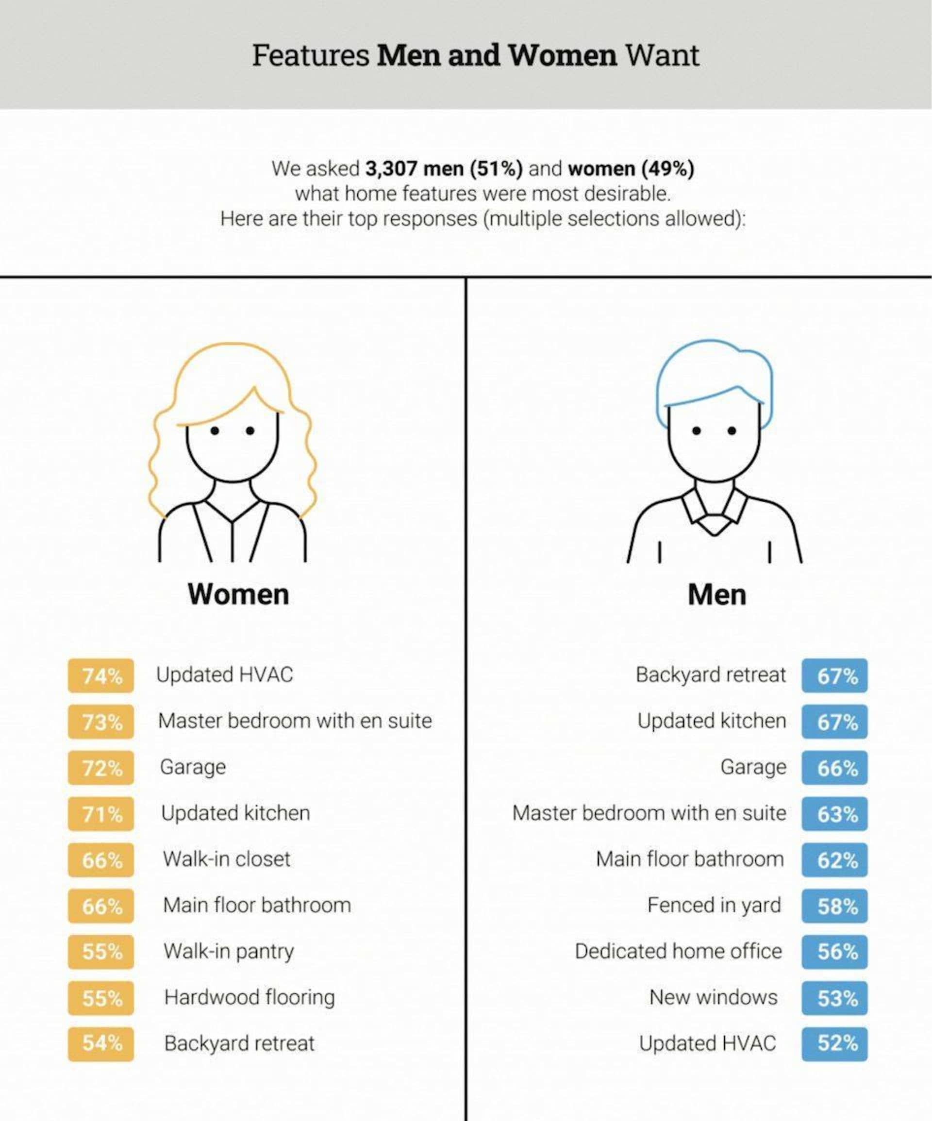 - 67% of men and 54% of women said a backyard retreat was their most desirable home feature. (2022 Zolo Homebuyers Survey of 3,300 new homeowners and potential first-time buyers)