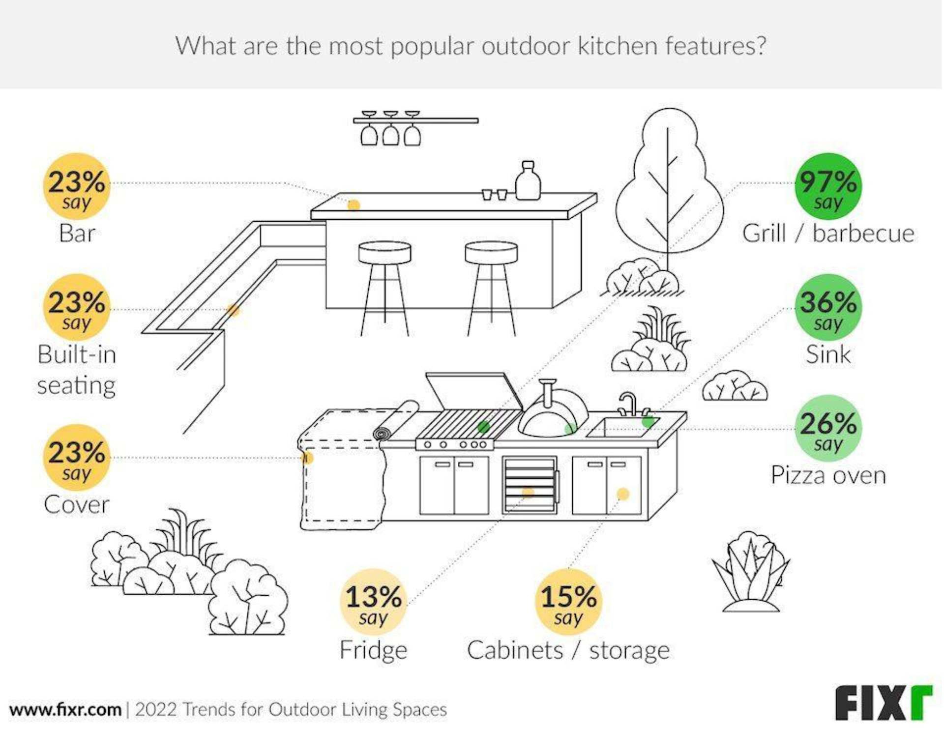 - 56% of the home design experts surveyed by Fixr.com believed homeowners put a high priority on making their outdoor living spaces look and feel more like their interior spaces. (Fixr.com 2022 Outdoor Living Trends Report)
