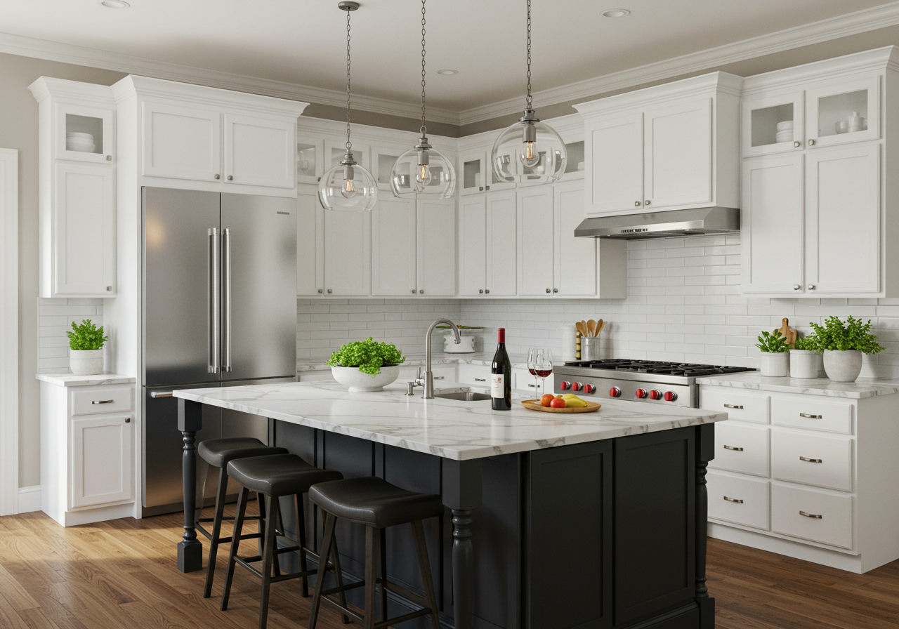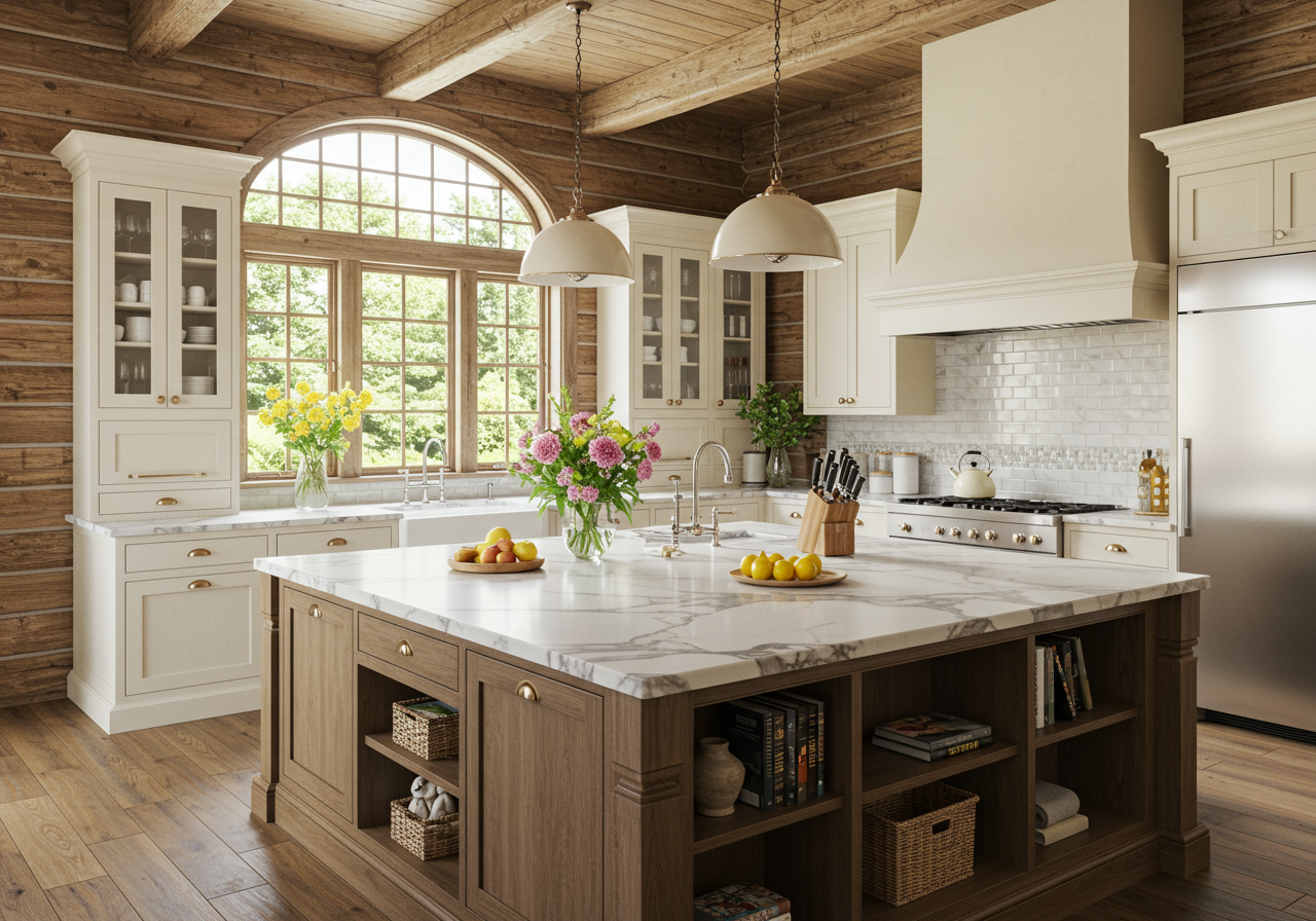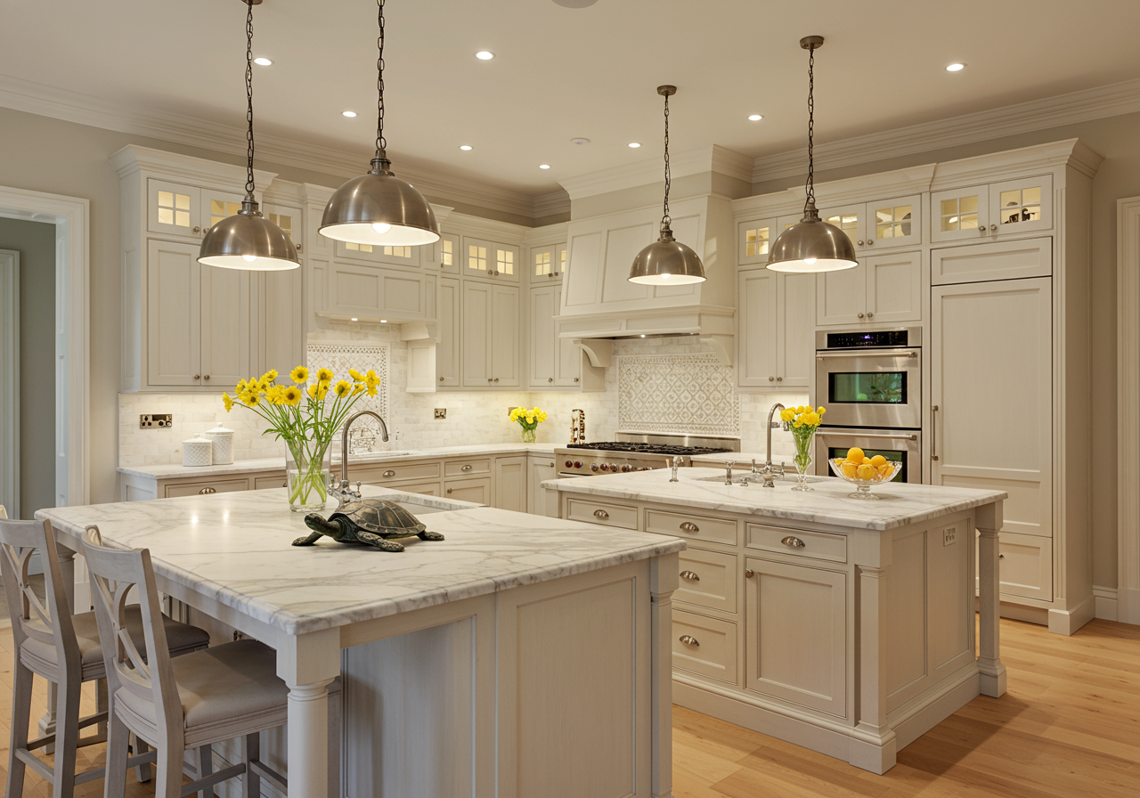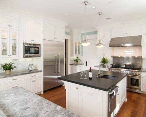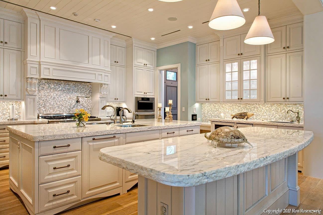 In this traditional kitchen, the quartz mimics Carrera marble.