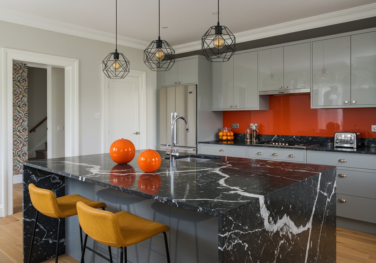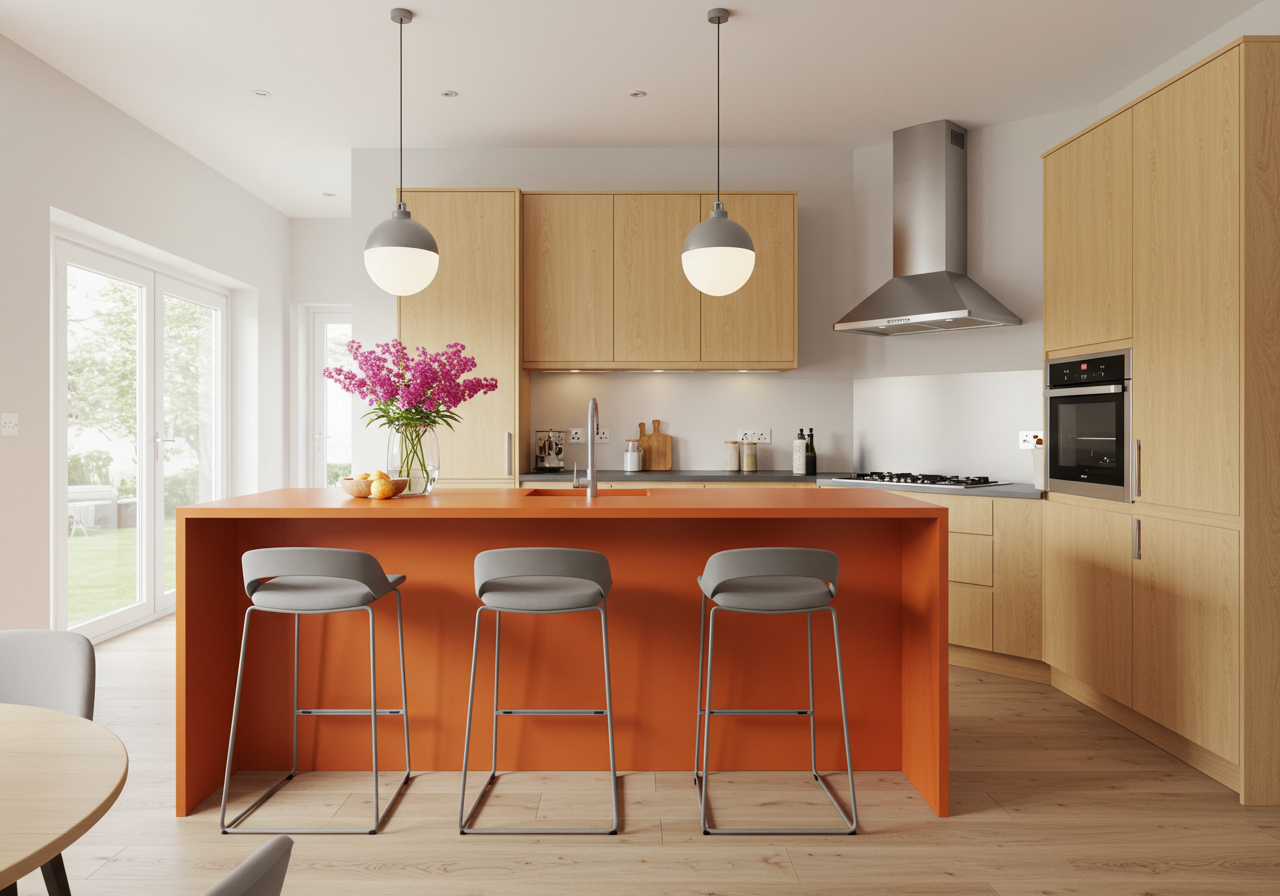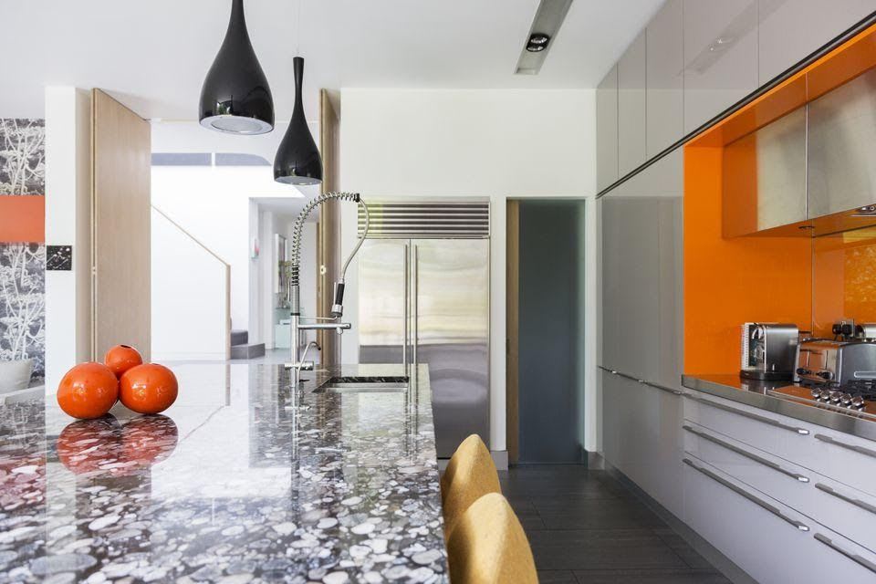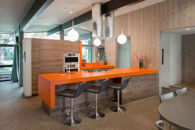 In this mid-century kitchen, orange quartz was central to design.