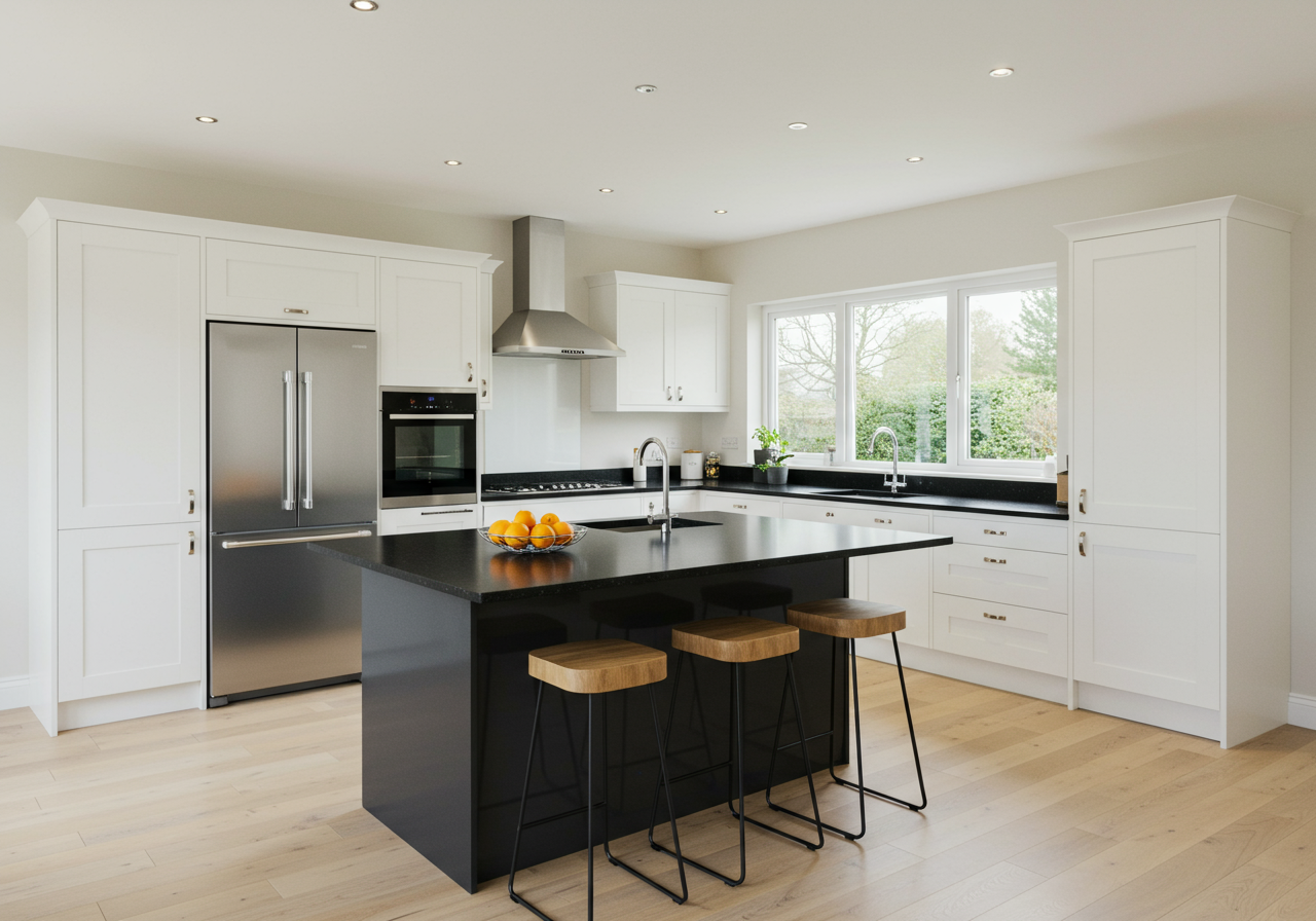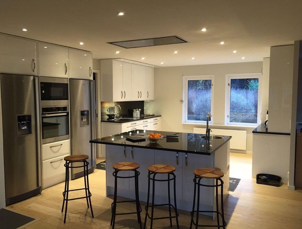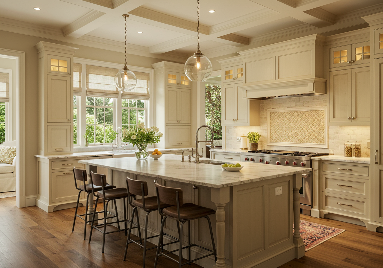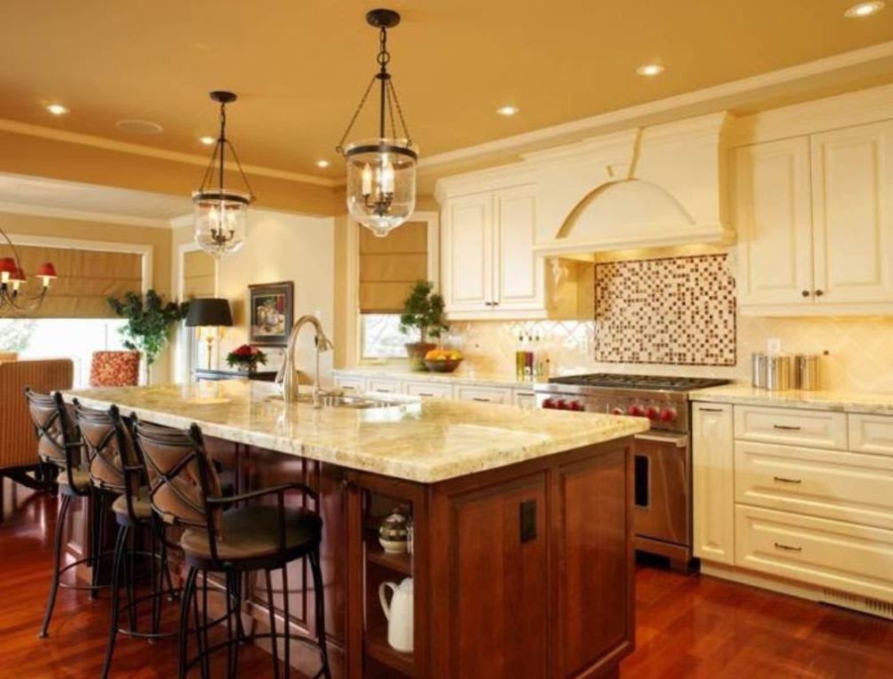 The addition of the task lighting under the cabinets and the hanging lights over the island give great flexibility in controlling the light scene as well as needed light for specific tasks.