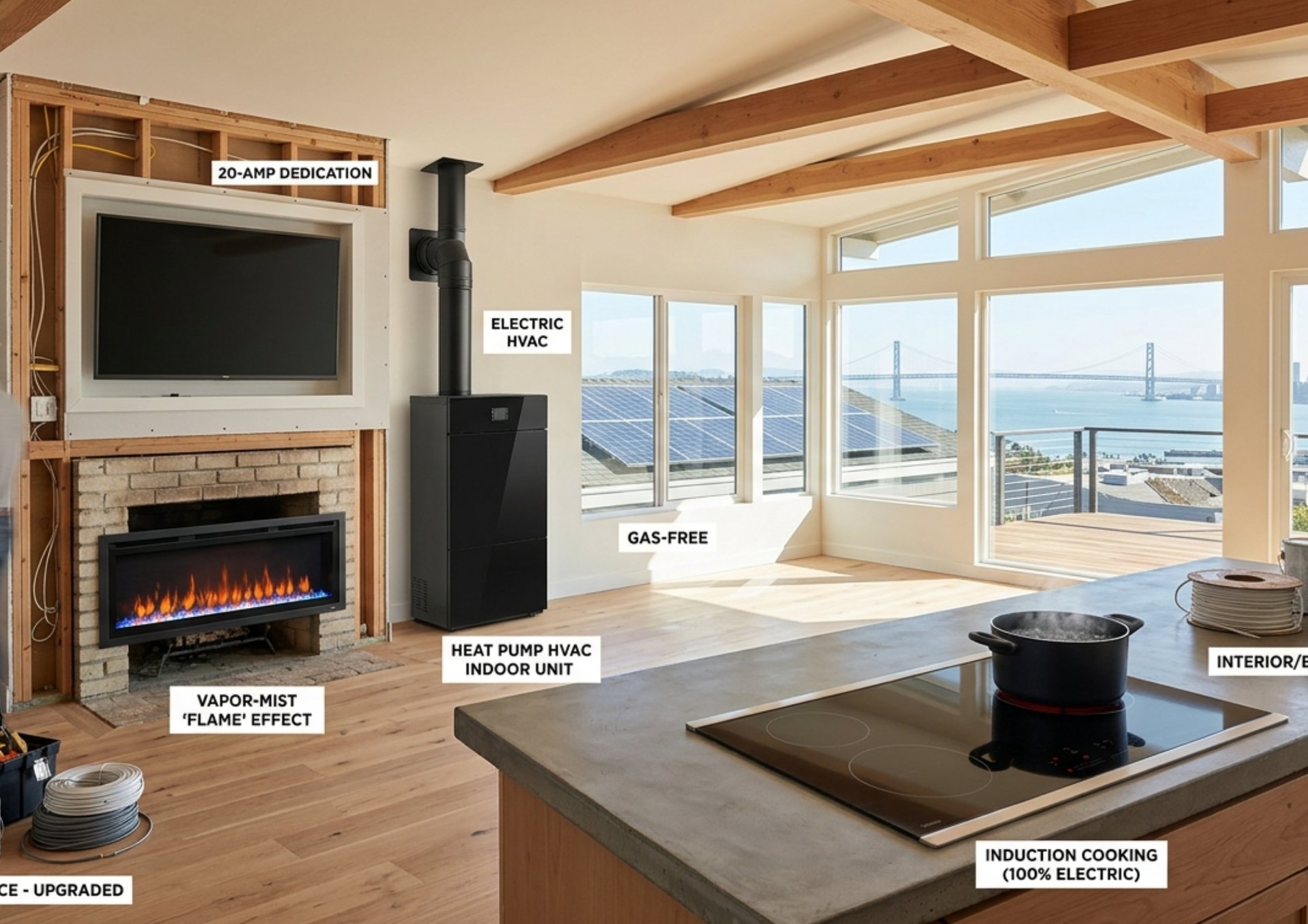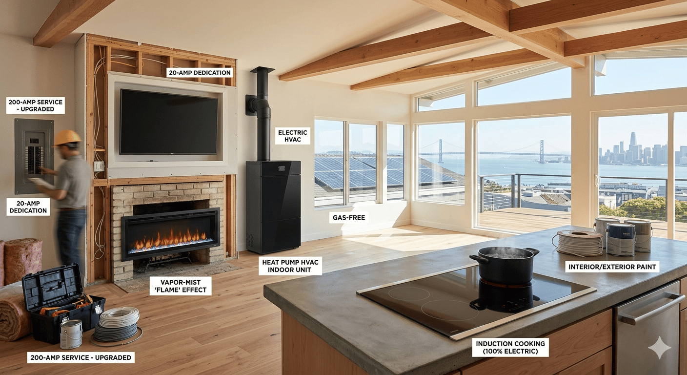 From the induction range in the kitchen to the vapor-mist fireplace in the living room, every electrification upgrade moves your home toward a modern Bay Area lifestyle.