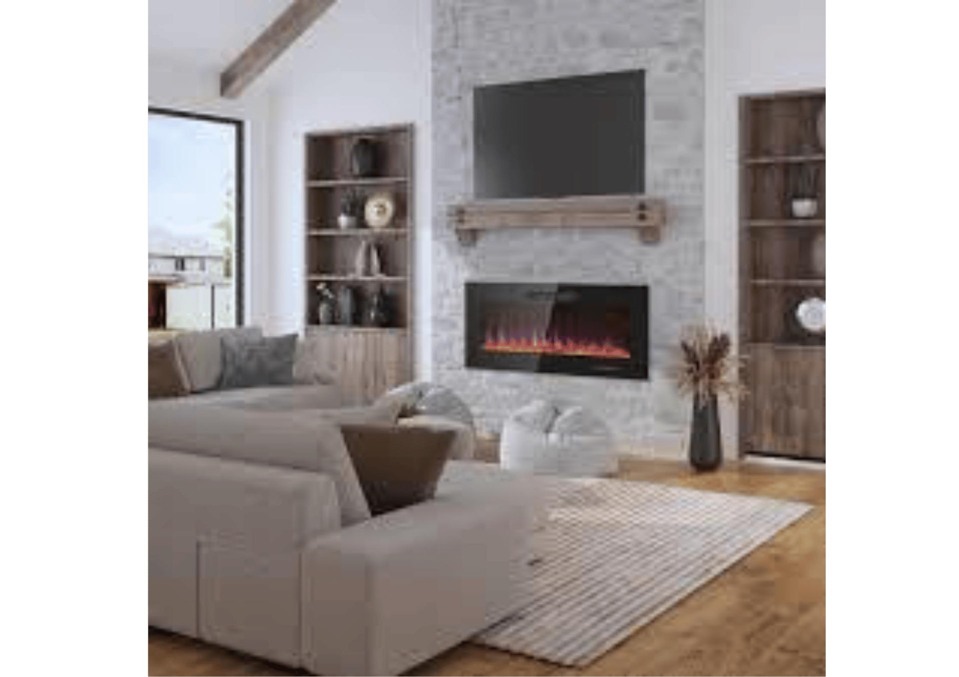 Because electric fireplaces don’t produce extreme heat or smoke, you can safely mount a high-end television directly above the fireplace without a bulky mantel or special heat shielding. The result is a clean, minimalist focal point that defines the modern living room.